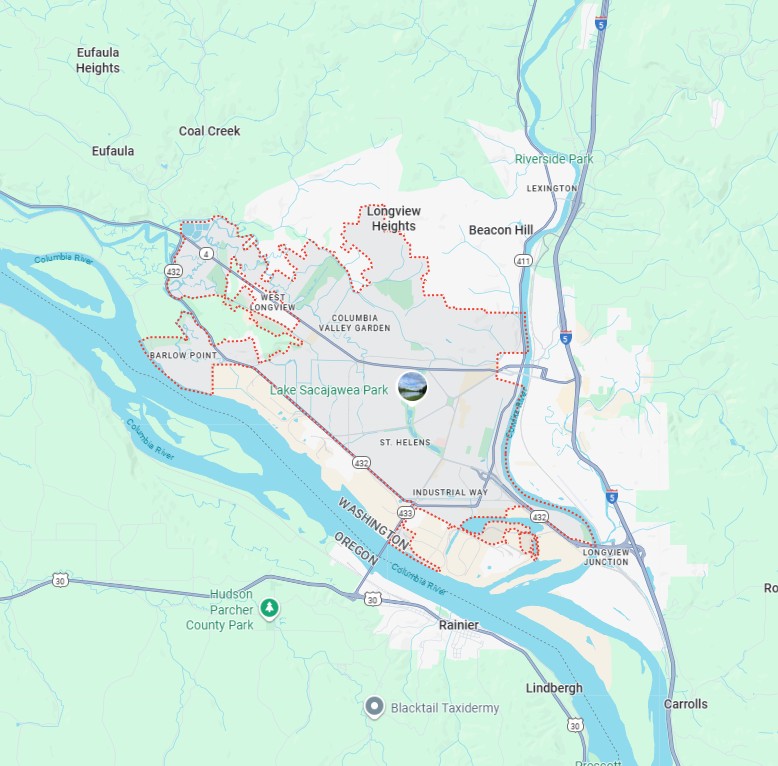 Coverage across Longview—including Downtown, St. Helens, Northlake, Columbia Heights, Mint Valley, Cascade Way, and residential pockets around Lake Sacajawea—plus nearby Kelso, Lexington, Rose Valley, Castle Rock, and communities along I-5.