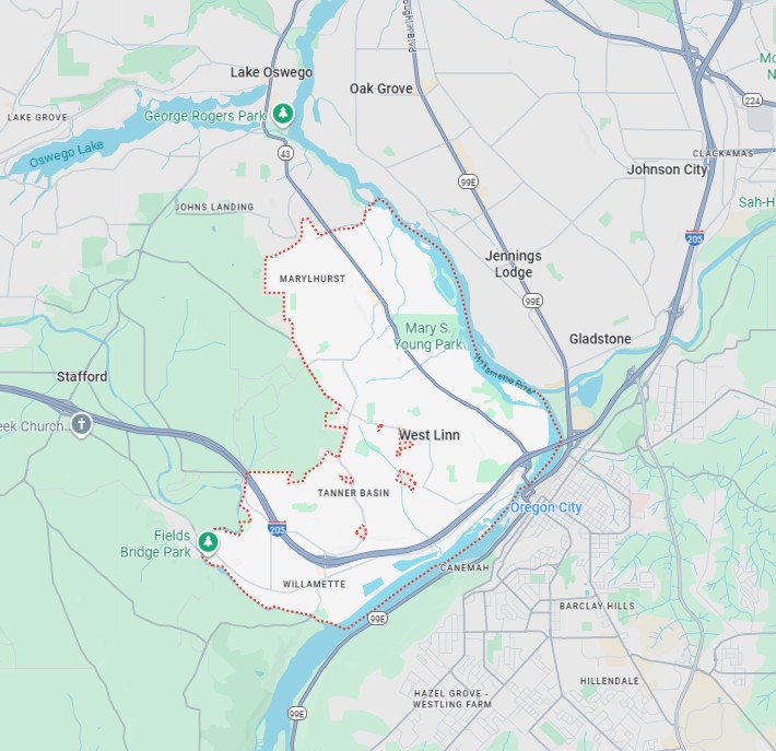 Coverage across West Linn—including Willamette, Bolton, Robinwood, Marylhurst, Hidden Springs, Tanner Basin, Savannah Oaks, Rosemont Summit, Sunset, Parker Crest, Barrington Heights, and Skyline Ridge—plus nearby Lake Oswego, Oregon City, Gladstone, and corridors along I-205 and Highway 43.