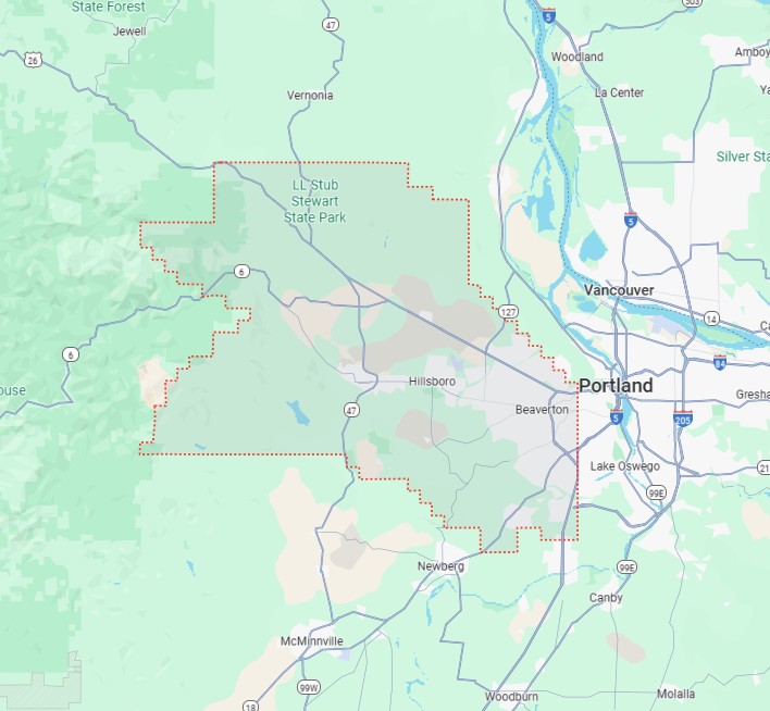 Beaverton, Hillsboro, Tigard, Tualatin, Aloha, Forest Grove, Cornelius, Sherwood, North Plains, Banks and surrounding communities along US-26, OR-217, I-5, Scholls Ferry Rd, TV Hwy, Baseline/Canyon, and Cornell Rd.
