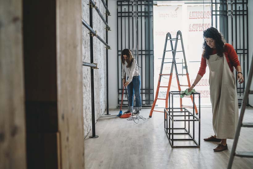 - Remove light debris, packaging, and sawdust from traffic paths.